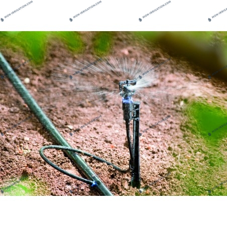 Micro asperseur WATERBIRD Classic pour l'arrosage en couverture intégrale ou sous frondaison Montage via connecteur complet 3/8" Diamètre d'aspersion de 9.5 à 11,5 m (en fonction de la buse) Jet à angle bas pour éviter de taper dans le feuillage des arbres Débit affiché à 1.5 bar de pression